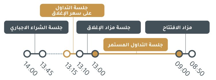 | جلسة تداول بسعر الإغلاق | 01:30:00 بعد الظهر | 01:35:00 بعد الظهر |